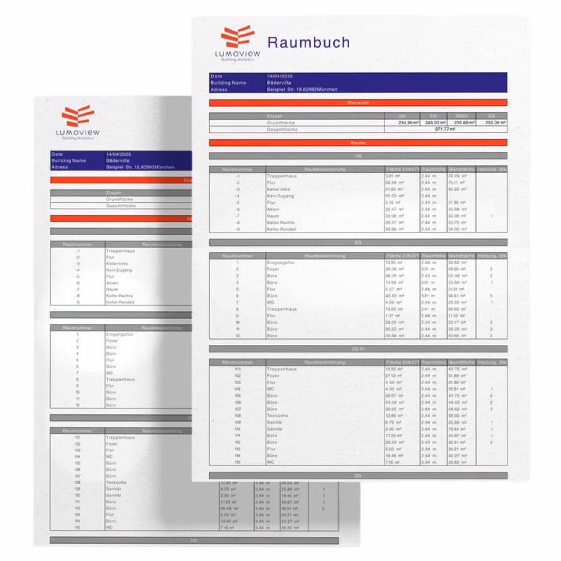 Als Teil der CAD-Modellierung bietet Lumoview Raumbücher für Fachleute an, die strukturierte, raumbezogene Bestandsdaten für Planung, Analyse, Verwaltung oder energetische Bewertung benötigen. Damit verbinden wir hochpräzise geometrische 3D-Daten direkt mit raumbezogenen Informationen – die perfekte Ergänzung zum 3D-Modell. Unser digitales Raumbuch enthält eine strukturierte Auflistung der Räume und Etagen Ihrer Immobilie, inklusive aller relevanten Attribute. Es ermöglicht Ihnen, Ihre Gebäude effizient zu verwalten und zu warten.